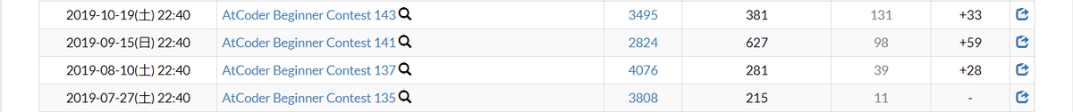 ABC135に参加して以来、コンスタントにABCに参加するようになったかと言うと実はそうではありません。そもそもABC135自体が突発的に参加したようなものだったので、そこで一旦やる気のピークが過ぎてしまいました。それから暫くの間は気が向いたら参加する、といった感じで月に1回程度の間隔で参加していました。